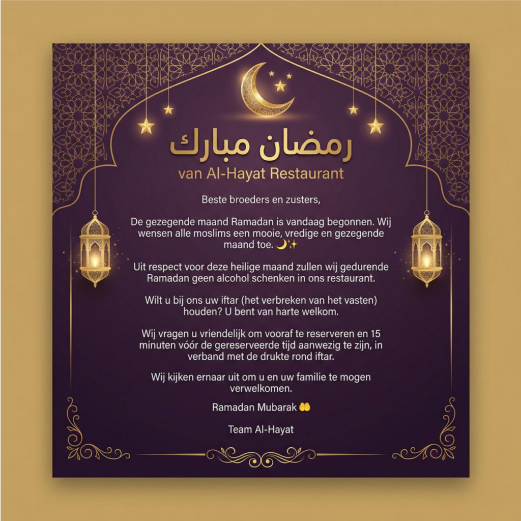 Al-Hayat betekent ‘’Het leven’’ in het Arabisch. Het leven is dan ook precies wat je terugvindt in restaurant Al-Hayat, zowel in het Arabische design van het restaurant als in de oog-en tongstrelende gerechten. Elke gerecht wordt met liefde en passie bereidt en vol met aandacht geserveerd.